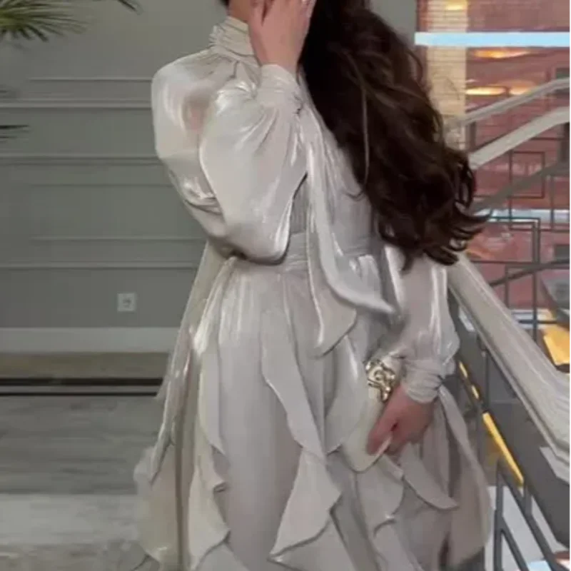 Verngo Shiny Satin Evening Dress High Neck Puff Full Sleeves Prom Gowns Modest Arabic Prom Party Dress Outfit Customized