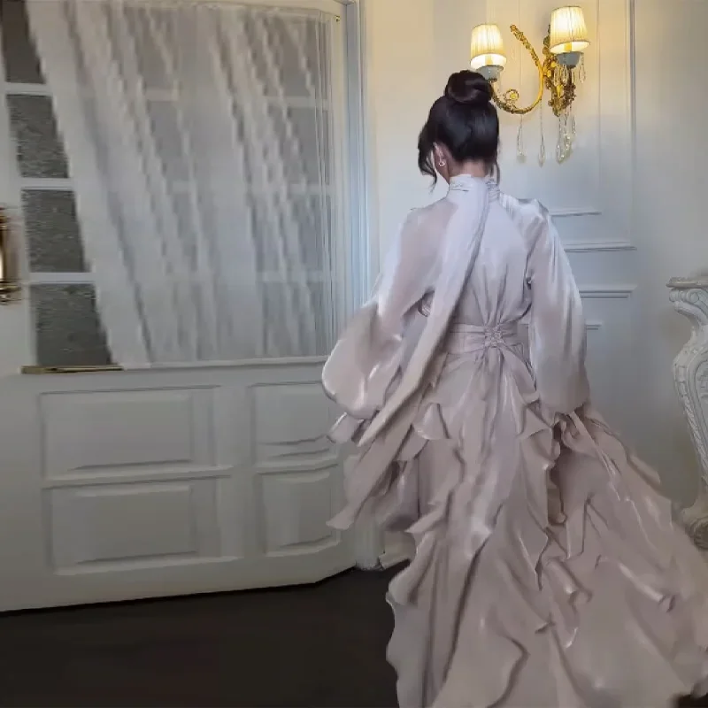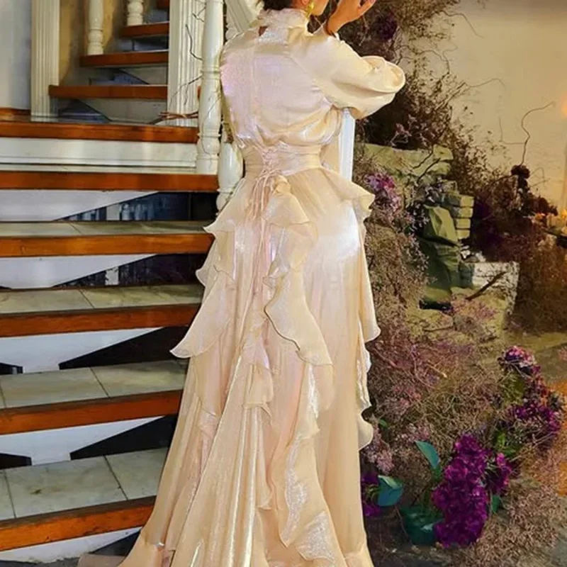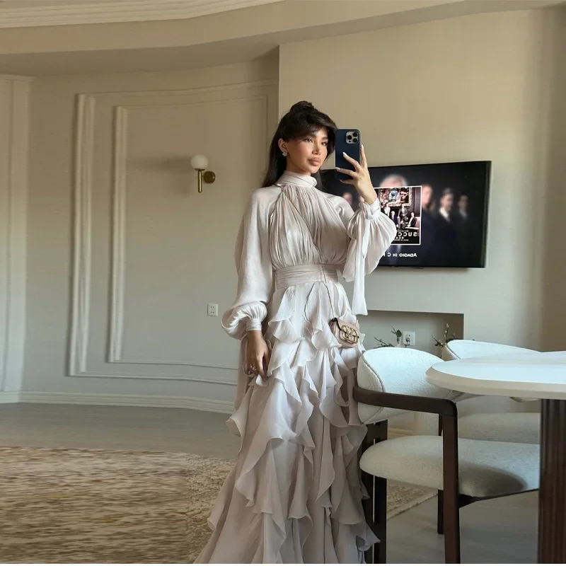 Elegant Pleated Multi-layer Ruffles Bow Collar Floor Dress Women Long Sleeve High Waist Evening Fold A-line Dresses Autumn Robe