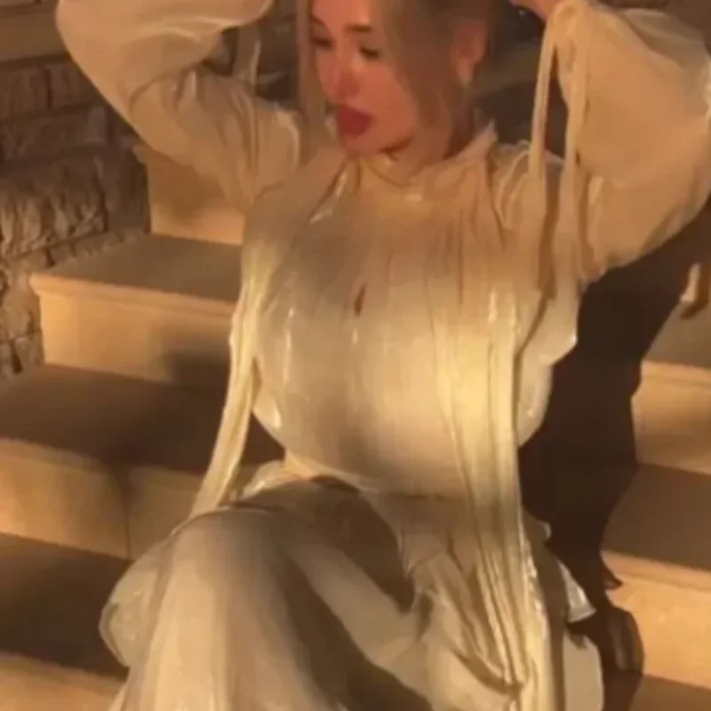 TWOTWINSTYLE Slimming Spliced Lace Up Elegant Dresses For Women Round Neck Long Sleeves High Wasit Patchwork Folds Dress Female