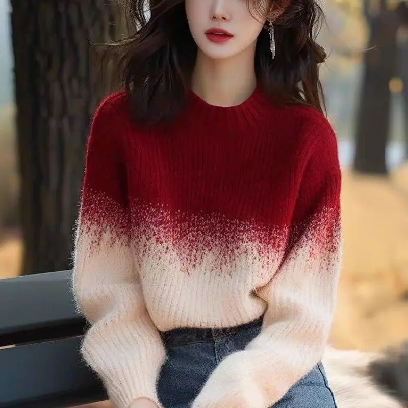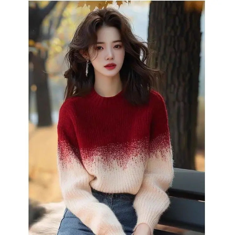 Ankela Red Apricot Gradient Round Neck Sweater Women's 2024 New Winter Knitted Sweater Unique and Super Beautiful Top