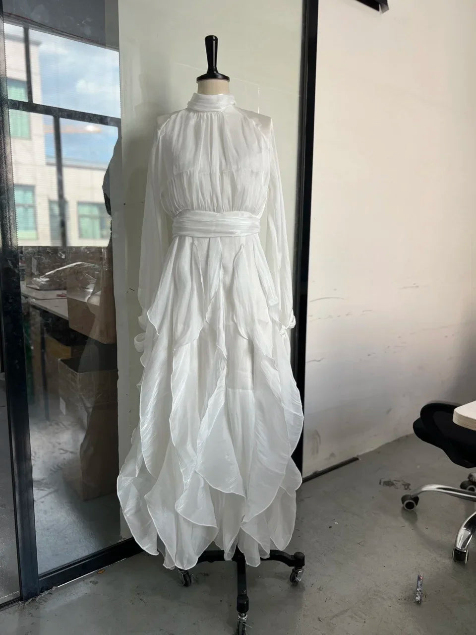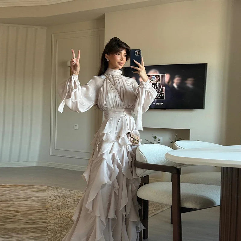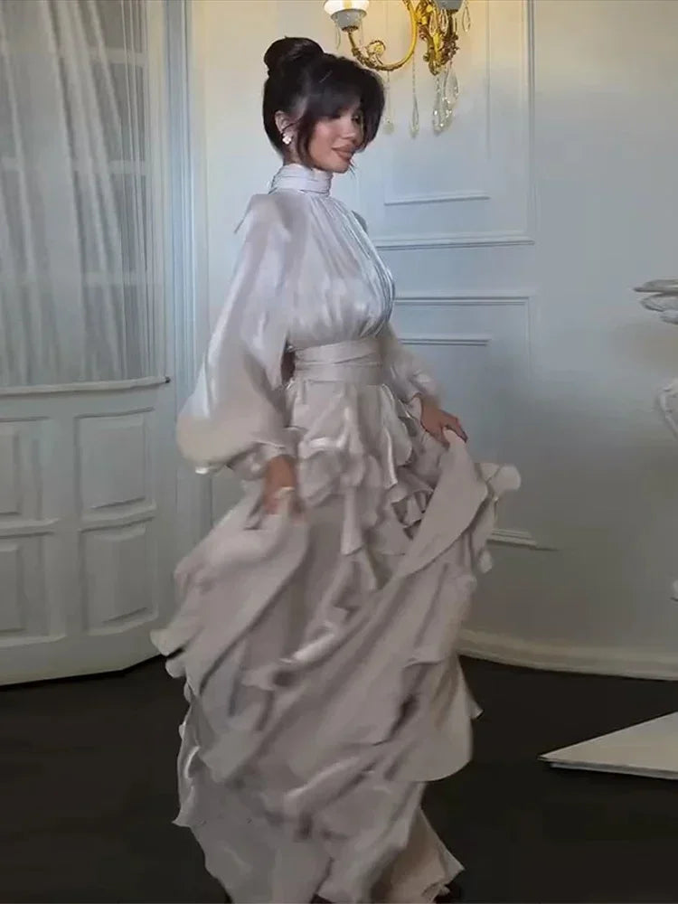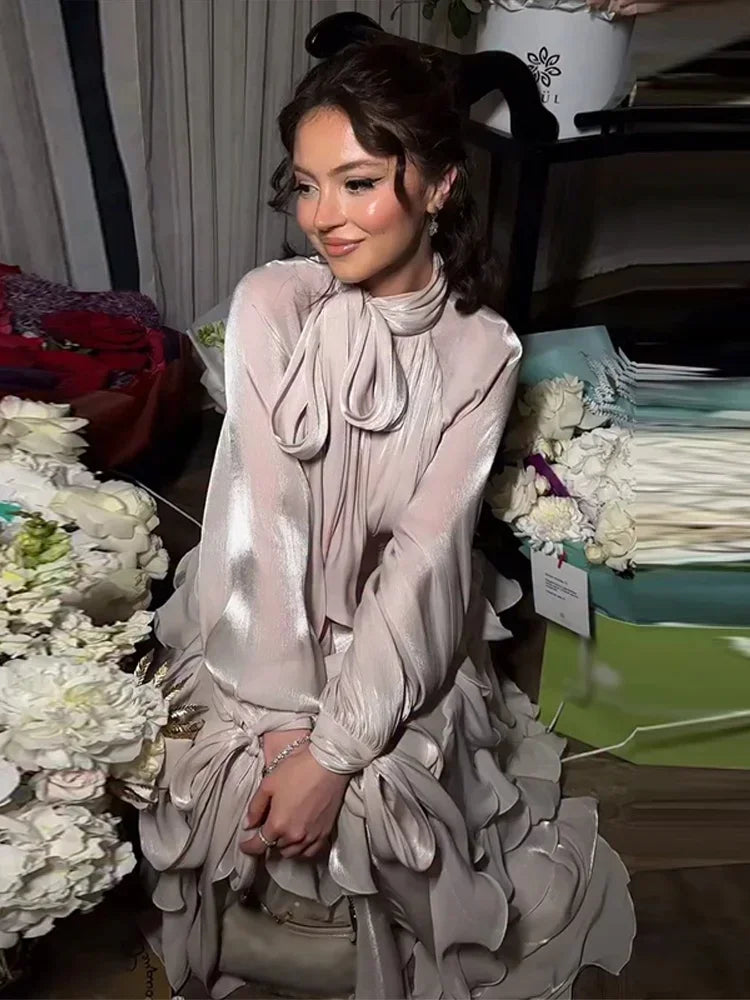 Elegant Pleated Multi-layer Ruffles Bow Collar Floor Dress Women Long Sleeve High Waist Evening Fold A-line Dresses Autumn Robe