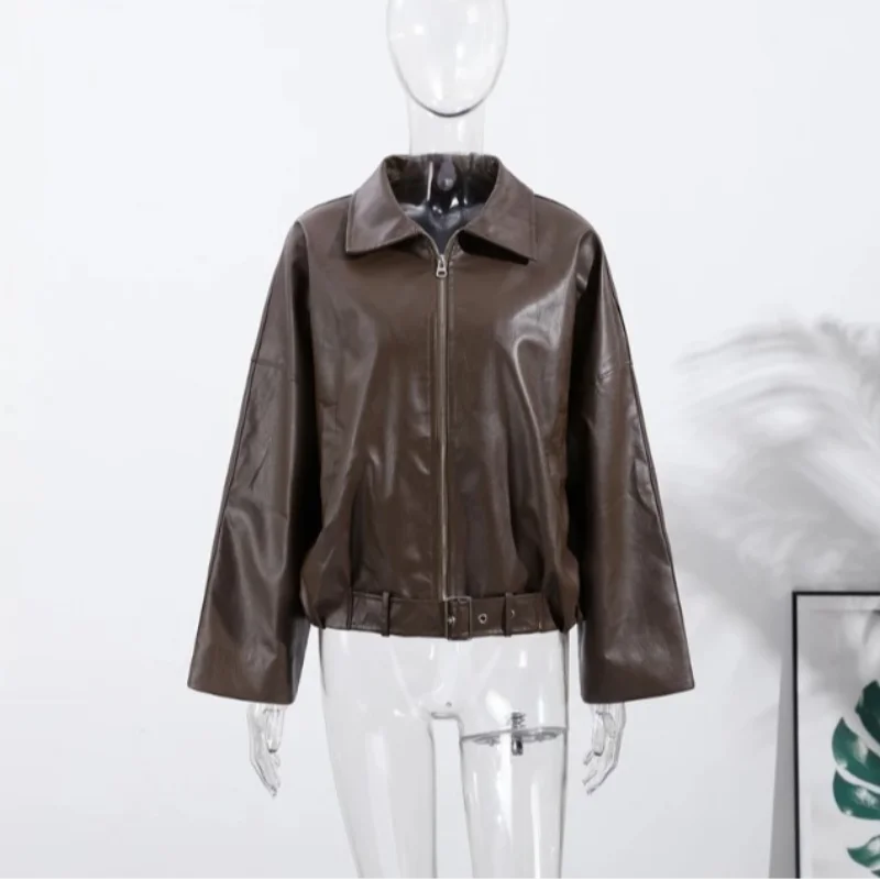 Stand Collar Short Leather Jacket Women Zipper Solid Single Breasted Full Sleeve Lapel Belt Coat 2025 Autumn Lady Chic Outwears